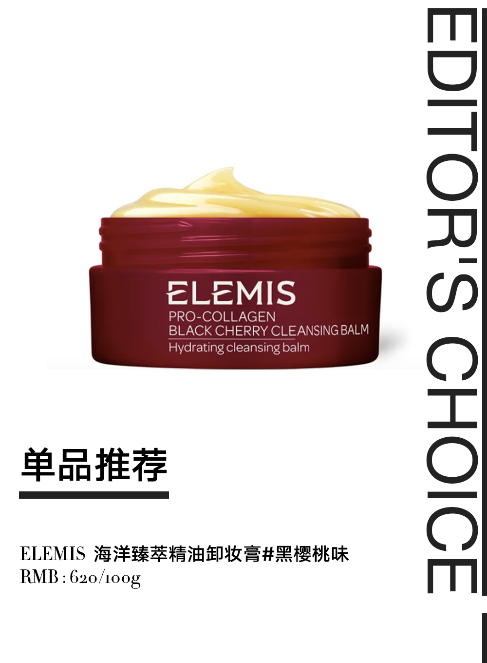 ELEMIS 海洋臻萃精油卸妆膏推出全新黑樱桃味,加入了沙柑果皮油,香脂檀树皮油,广藿香与丁香叶油等协同润养,一触即溶,迅速乳化,在微醺酸甜的甘美气味中完成卸妆清洁的护肤仪式,让皮肤在洗净后如天鹅绒般柔软。