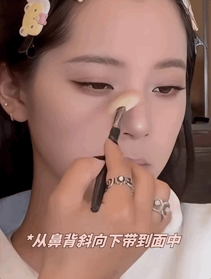糖化后的脸失去的不是彩度,而是——光,所以我们需要做好提亮,选择哑光提亮,提亮山根至鼻头。