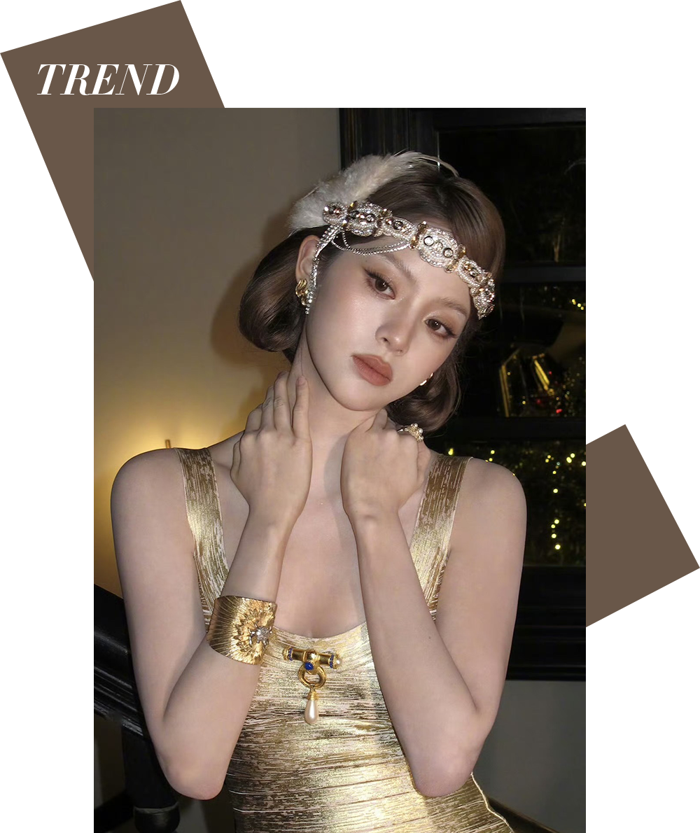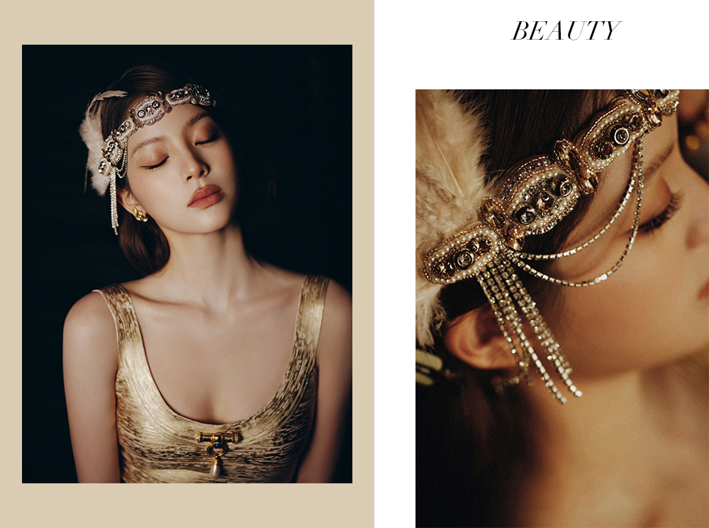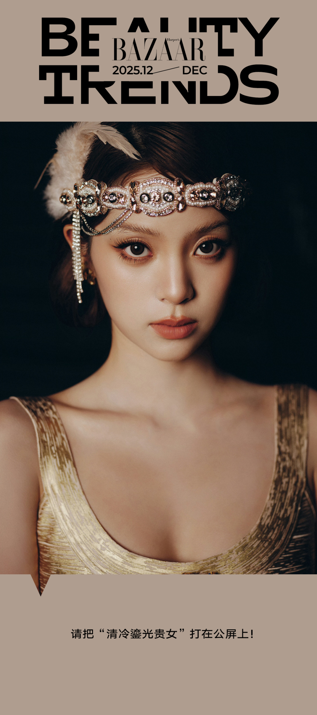 羽毛发饰配合金光闪闪的前额发带,衬得肩颈线条冷白如瓷;刚刚好垂至颧骨下方的金色耳环,和冷茶棕发色冷暖碰撞,把“贵气不艳俗”的分寸拿捏得刚刚好。