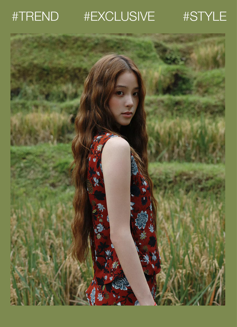 栗棕色的法式蛋卷发,蓬松的卷度刚刚好轻盈地挽住热带的潮湿;红色碎花无袖裙直接把盛夏的鲜活糅进了稻田的绿意里,活脱脱一个灵动的热带小精灵!